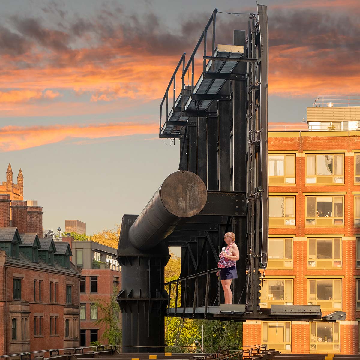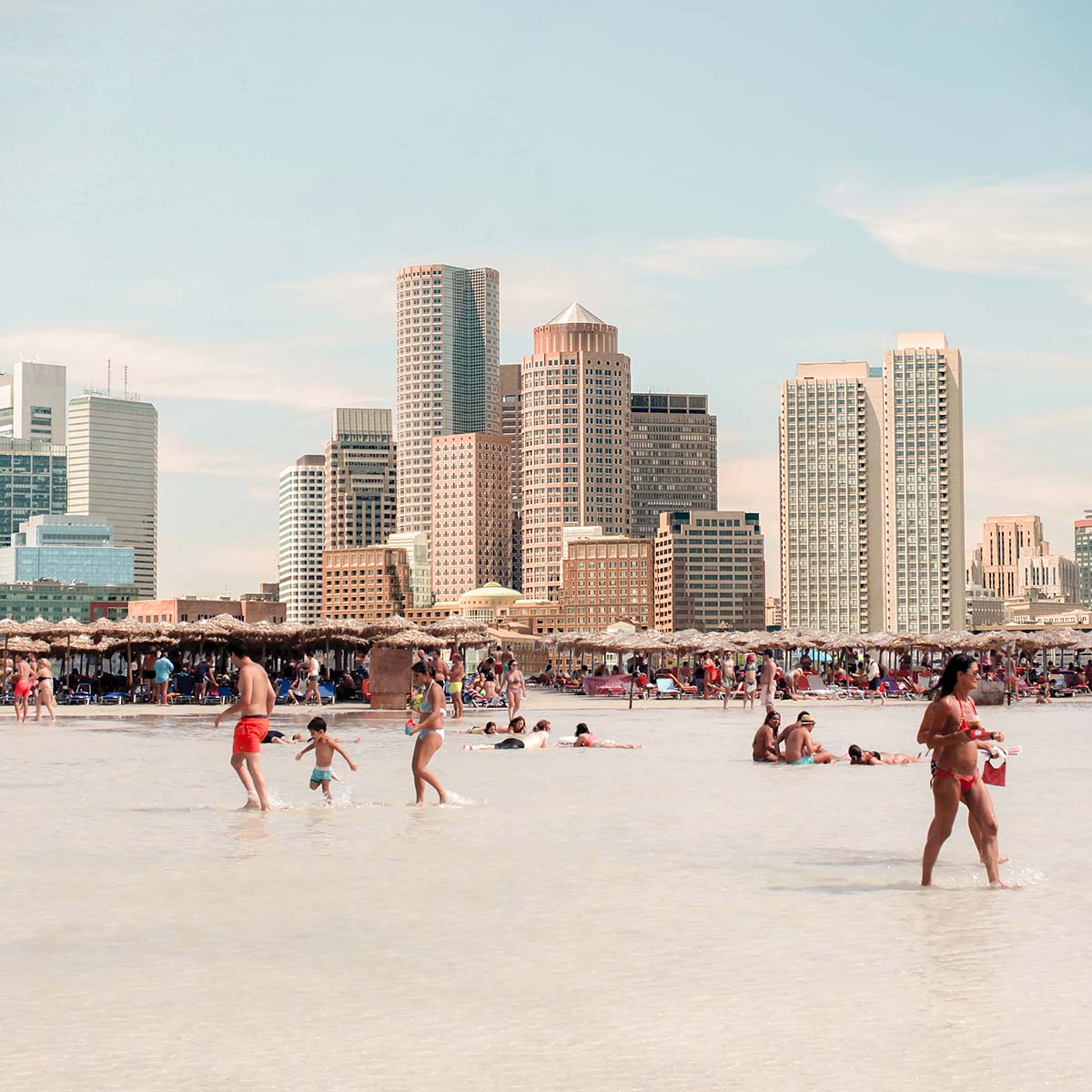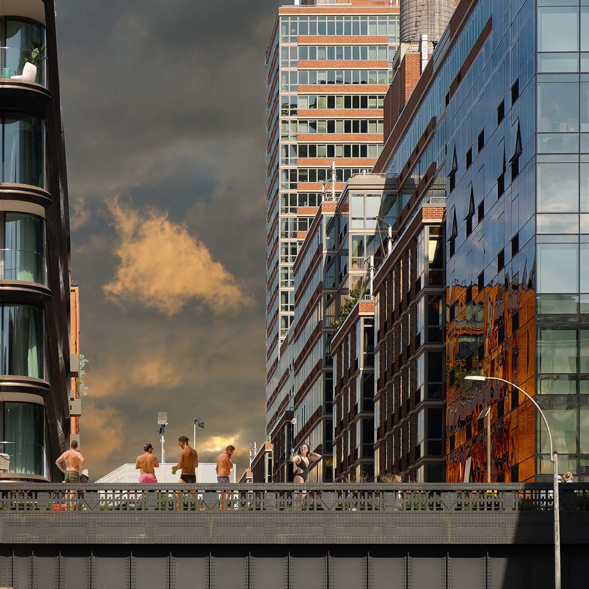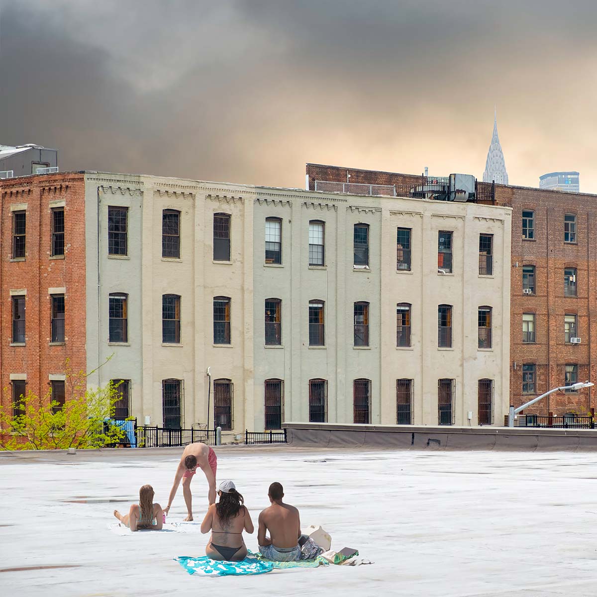 Surroundings play a dominant role in shaping experience. Each image in this series is a composite of three separate original images: one of someone enjoying leisure at the beach, a cityscape, and a photograph of dramatic weather as seen from my back porch. Separately, they are subjects I love to photograph for their beauty and the awe they inspire in me. Together they tell a story of city dwellers searching for moments of relief in a world shaped by climate change, and the struggle to find a balance between an environment in crisis and manmade structures.