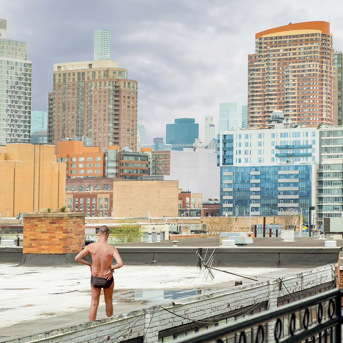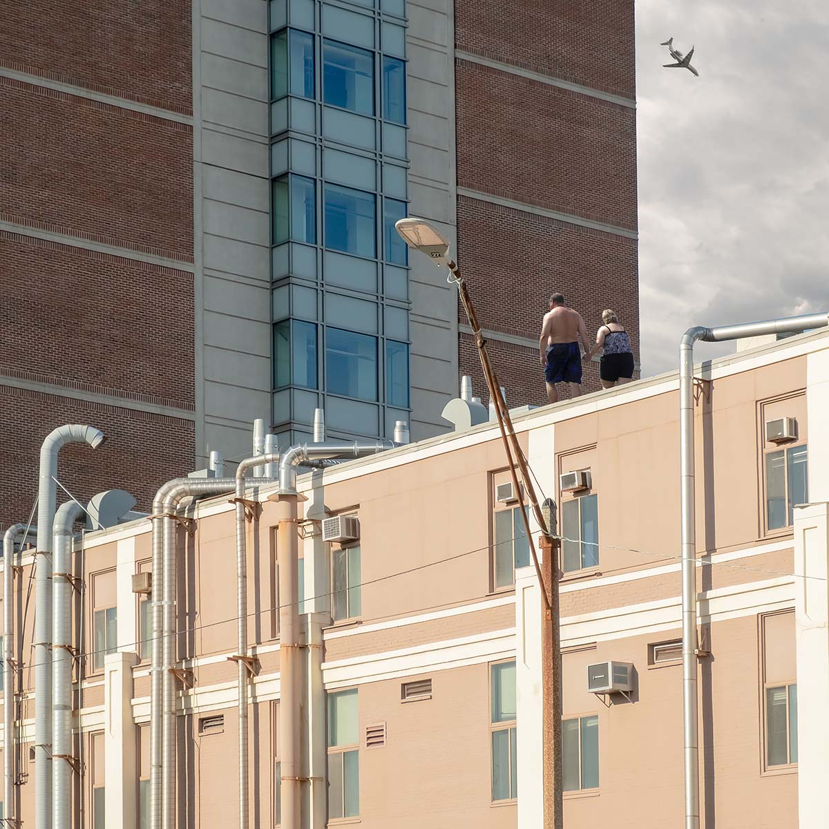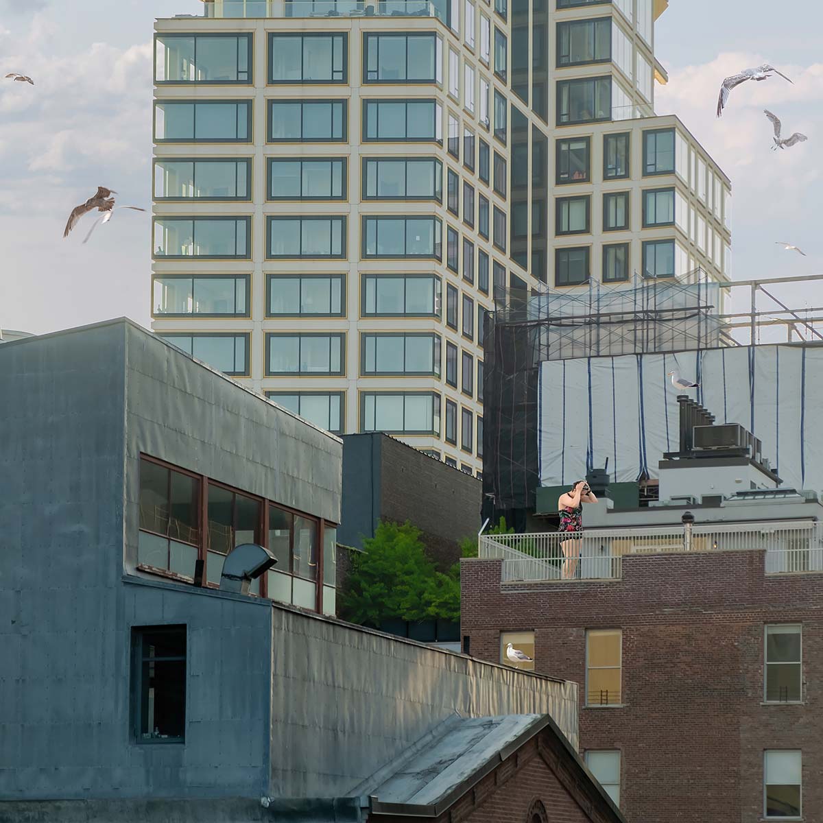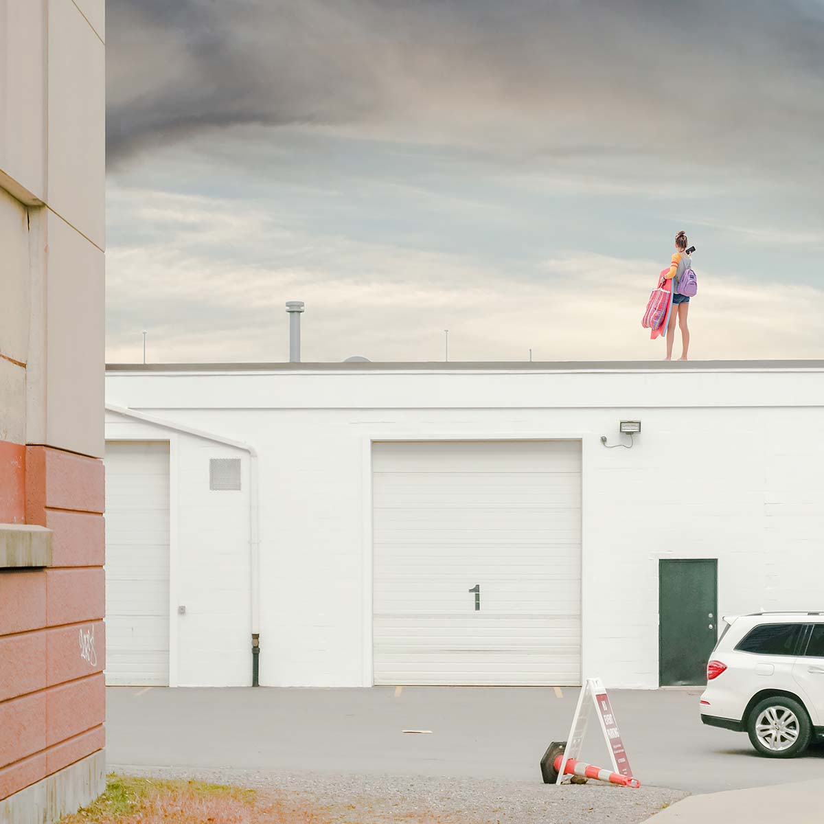 Surroundings play a dominant role in shaping experience. Each image in this series is a composite of three separate original images: one of someone enjoying leisure at the beach, a cityscape, and a photograph of dramatic weather as seen from my back porch. Separately, they are subjects I love to photograph for their beauty and the awe they inspire in me. Together they tell a story of city dwellers searching for moments of relief in a world shaped by climate change, and the struggle to find a balance between an environment in crisis and manmade structures.