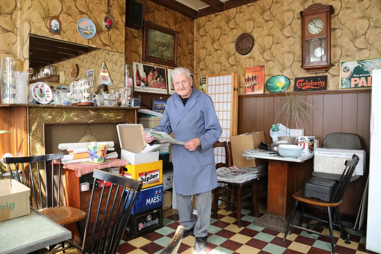 Noela, a nice lady behind the counter, who liked to go to the hairdresser first and put on a clean dress for the photos. Unfortunately, Noela recently had to close her smiss after more than fifty years of service, her health no longer allowed it, in any case she always did it with heart and soul. Everyone was welcome, from the men of the nearby Woodimport Vandecasteele to a card club, a sports club, the regular customers, neighbours, the Okra club etc... Only when there was a bike race on TV, it sometimes happened that Noela was glued to the screen, a very big lover like her, could clearly foresee and discuss the race like the TV commentators, the newspapers with the results of the previous days in the area. She is a serious fan of the lesser-known Italian rider Marco Marcato who hangs out as a poster in a big way. De Smisse opened as an inn after conversion in 1950, together with her husband Hubert they moved in, in 1970, after his death, Noela continued on her own. The café is full of figurines of blacksmiths and the like that keep the memory of the past alive.