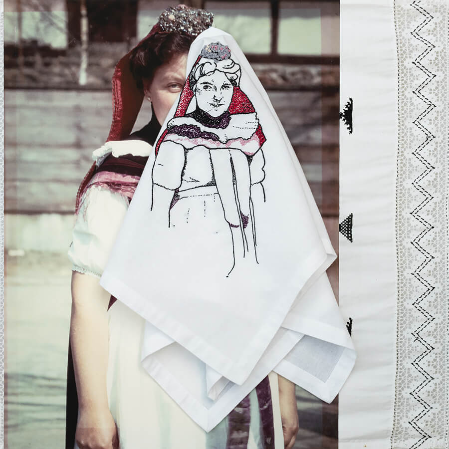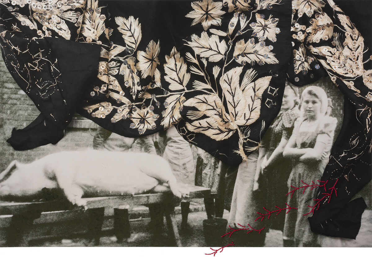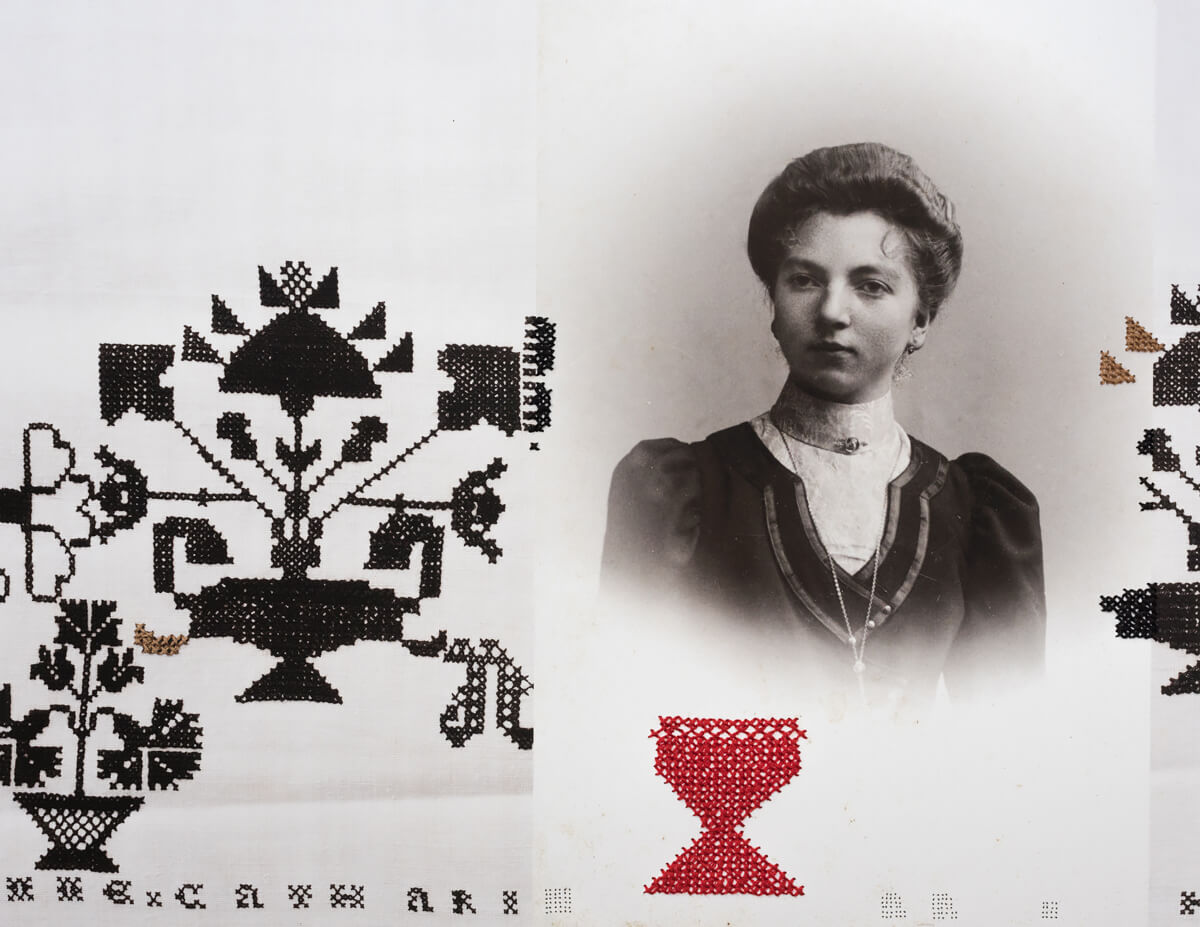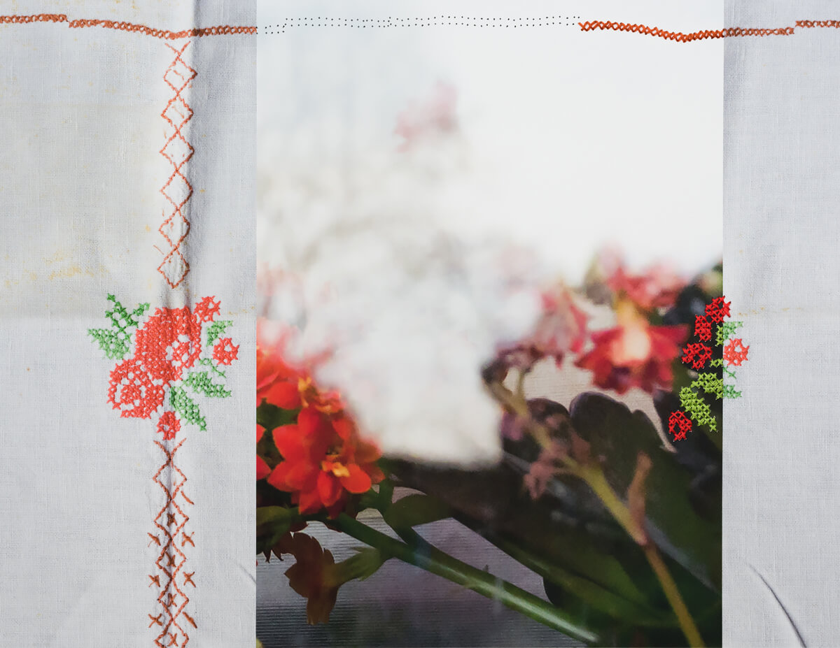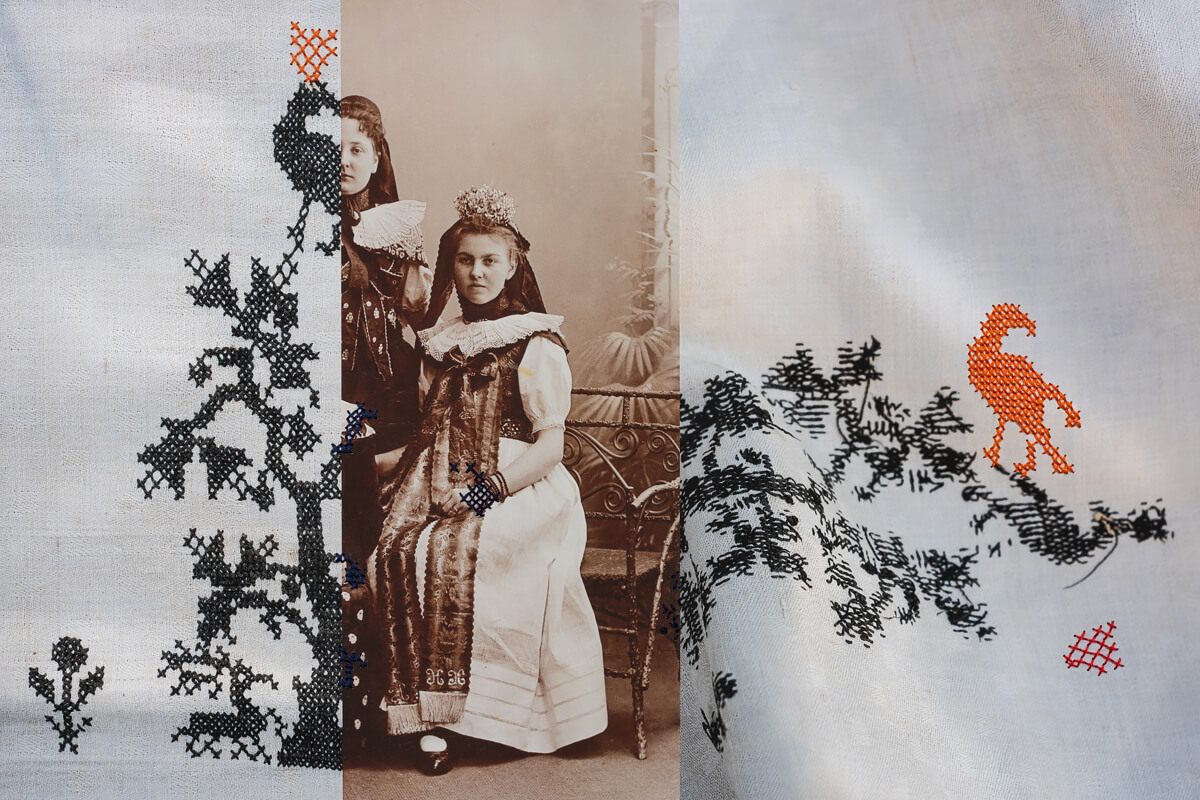 In this series, my composite images take the form of tapestries, combining images of embroidered Spin Club fabrics with new and old photographs from the village. I connect the present and the past by recreating and re-imagining pieces of the embroidery. Spin Club tablecloths, napkins and wall hangings (some dating back to 1799) have been passed down from generation to generation. By following the stitches in these fabrics, I follow a path through the lives of my ancestors - their layout of a perfect pattern and the mistakes they made. Along the way, I add my own mistakes. The fabrics also reveal the passage of time, stained and distorted after sometimes decades of use. The patterns I have stitched myself into the paper are only abstractions of the original Spin Club designs, fragments of memory. After all, memory is fleeting, and changed forever in the act of recollection. Sometimes the stitching is incomplete, creating an invitation for future generations.