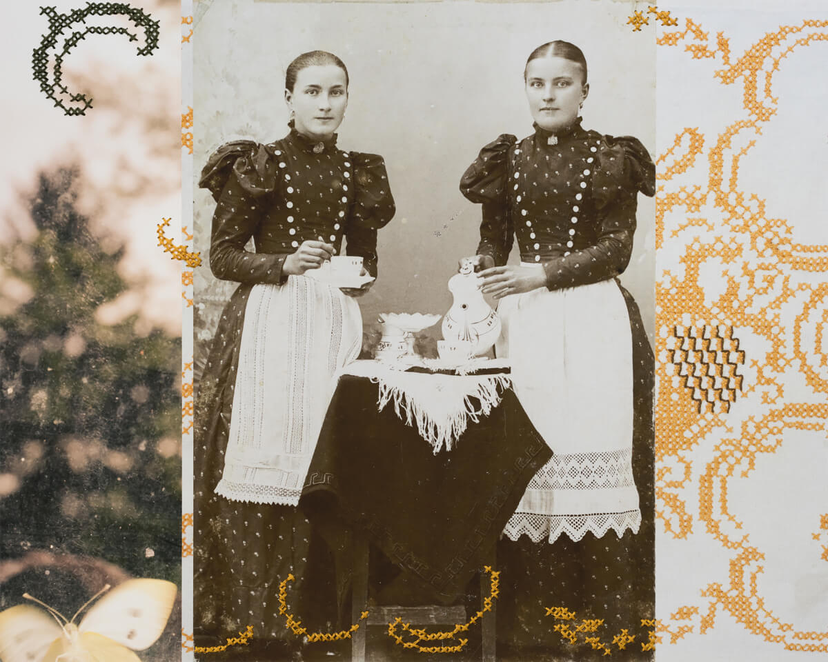 I grew up in a small farming village in Northern Germany. A village that is bound to its history and that stands out through its traditions even today. Long ago, village women met regularly in "Spinneklumps" (Spin Clubs) to spin wool, embroider, and stitch fabrics for their homes. I imagine their conversations as they worked, the beautiful stories that lifted their spirits, as well as the stories of sadness, sorrow and loss. In modern times, village women continued to meet in this tradition, but shared stories over coffee and cake instead of needlework. These close-knit groups of women often stayed together until their death.