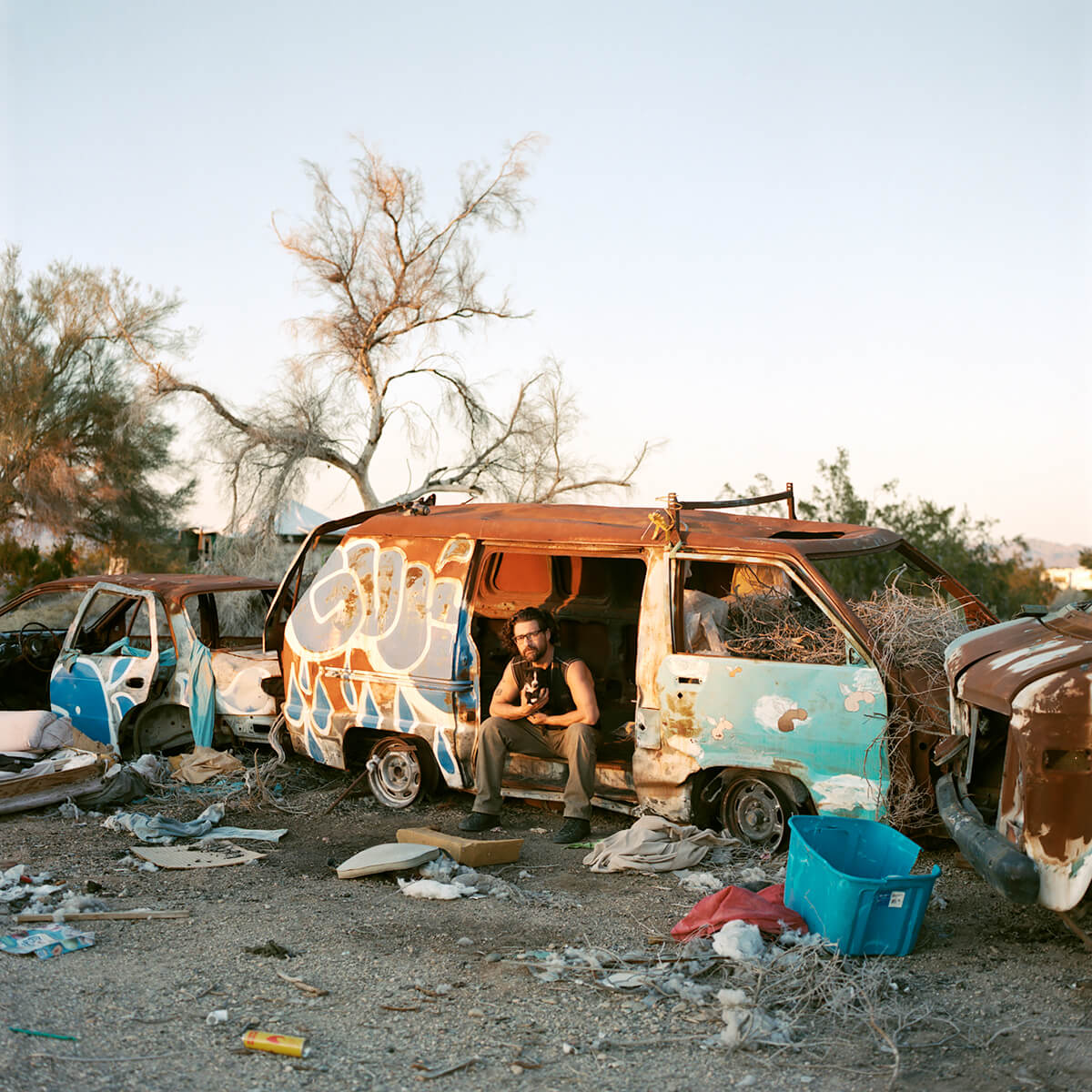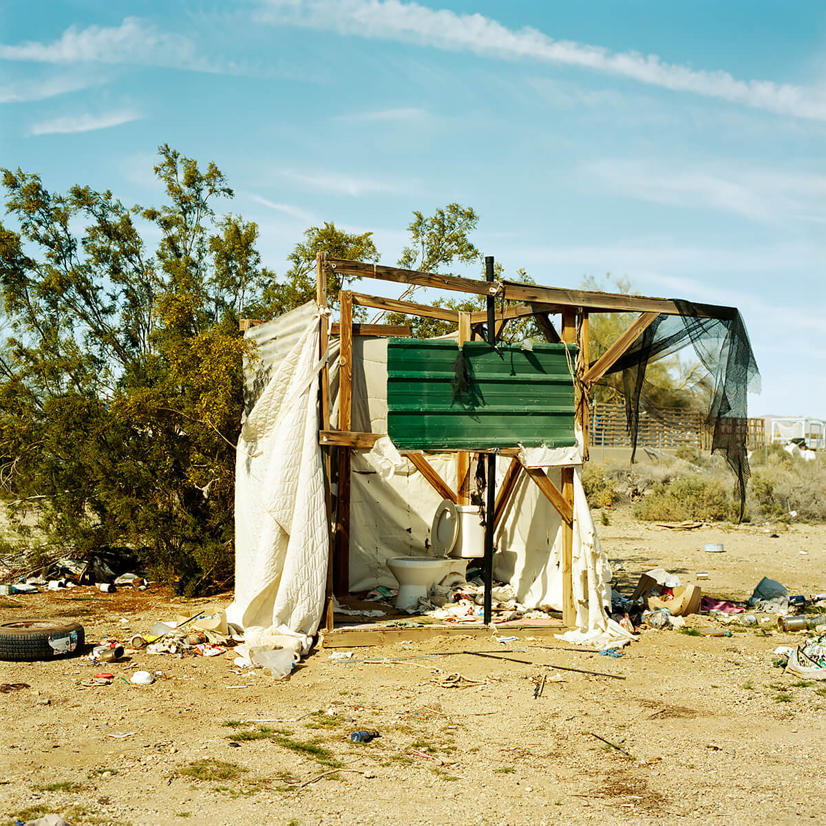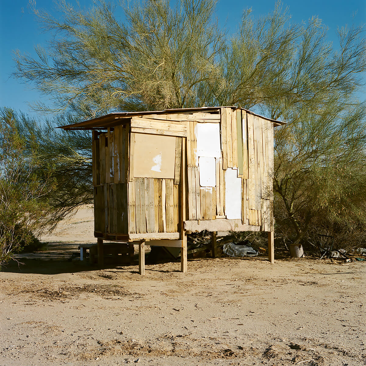 Slab City sits on the leftover infrastructure of Camp Dunlap, a WWII marine base activated in 1942 as a training camp for action in North Africa. The base also provided training areas for army troops under General Patton, a bombing range for planes from a nearby Marine Air Station, and a staging area for smaller Marine groups. It was deactivated in 1945. When the land was returned to the State, only the concrete slab foundations remained to float on the shifting sands. Slabbers have been shifting with these sand for decades; building, scrapping, repurposing, surviving, dying. They’re a motley crew, as varied as anywhere else. The year-round population is modest. Roughy fifty stay through July and August when temperatures are mercurial and even rattlesnakes seek the shade of campers. Their ability to endure inhuman conditions year after year is matched only by a shared distaste for the gridded boiler plate of city life. Many are on SSI, SSDI, or just plain broke. Modern American pioneers, claiming their slab and declaring themselves master. A free range society of feral folks occupying a chunk of desert in Southern California. Slabbers have different reasons for coming here and staying. Many are transient, coming for the warmth in winter. Some seek anonymity, others to forego the rat race. Veterans with PTSD neighbour hippies, meth heads, and Oxycontin addicts. Survivalists and religious men come to the desert to test themselves as their forefathers have for millennia. Felons hide deep in the Slabs under cover of creosote to evade the authorities. Average American families that never recovered from the Great Recession or want to stretch their retirement funds. Artists, musicians, philosophers. Few of them enjoy the conveniences we take for granted. There is no free drinkable water, no tap to turn. Slabbers can filter the East High Line canal, brown with farm runoff, or take from the faster moving Coachella Canal feeding Palm Springs and Los Angeles. Otherwise, you pay local suppliers. Garbage is either kept by Slabbers (for future reuse) or dumped for lack of municipal pick- up. Solar panels and deep cycle batteries provide power to run fans and swamp coolers in the hottest months. Sanitation varies from rvs to composting toilets and gopher holes. To each his own. There is a cost to living free.