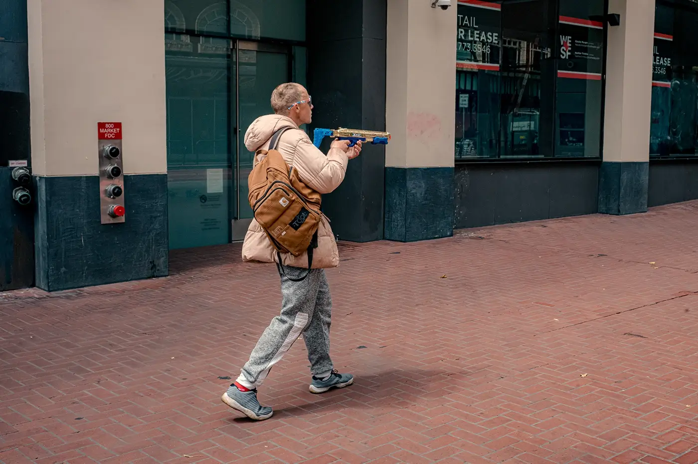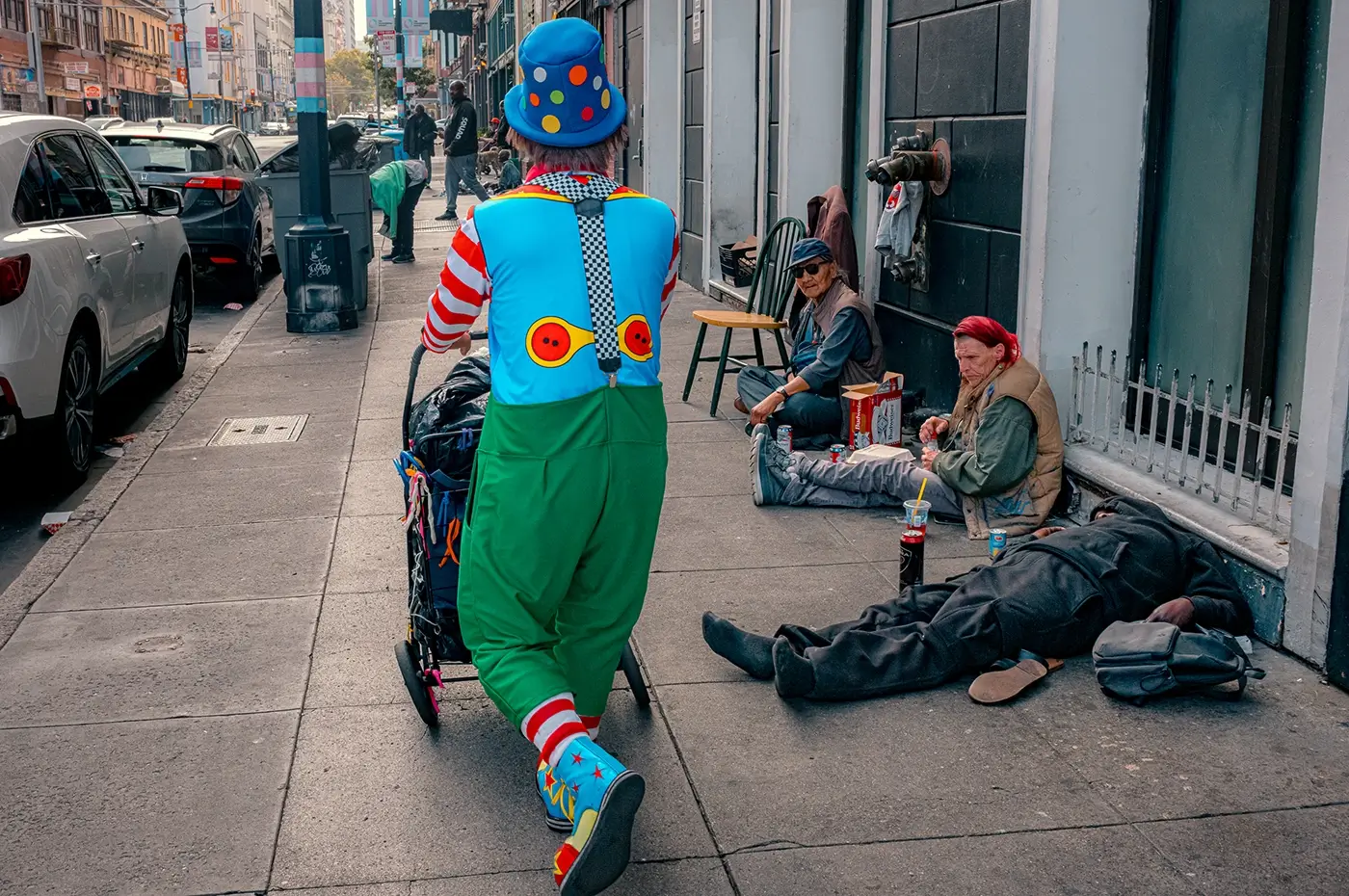 I am a junkie, and my drug is street photography. Since 2014, I have been walking thousands of miles in urban centers, documenting how I see the world. The many years working as a street mime have strongly influenced his photographic voice. I am trained to anticipate and respond to human behavior to make people laugh. So it’s no surprise that many of my street photos are quirky, funny, and satirical.