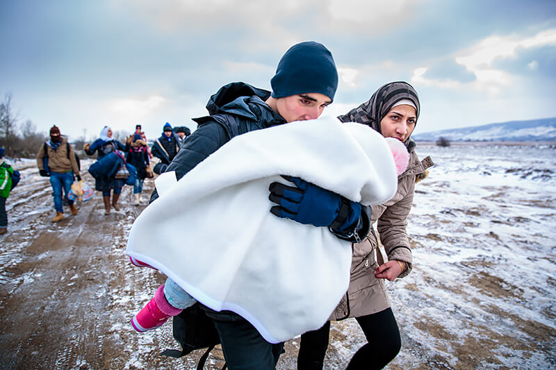 After crossing the Macedonian-Serbian border, refugees walk the unofficial refugee route in subfreezing snowy weather. Near Miratovac, Serbia, January 17, 2016. Produced for Mercy Corps.