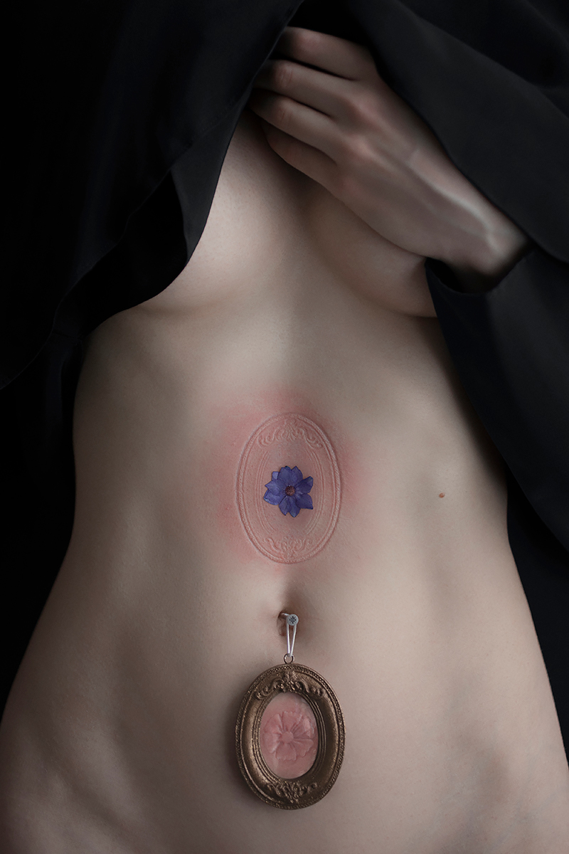 Although greatly influenced by historical drama, my work is deeply personal and symbolic in nature. I suffer from a hyper-sensitive skin condition. As a teenager, I would often attempt to cover it up; I resented being asked if I had accidentally burnt myself. Throughout the years, I have learnt to see my skin as a canvas of expression, rather than an ugly inconvenience that should be kept hidden. I use my very own body to explore the themes of solitude and objectification, often employing antique garments or props to depict the parallels between my experiences and the inferior female position in Victorian Britain. I honour the concept of transforming hidden pain into art – exposed, disturbing and beautiful.