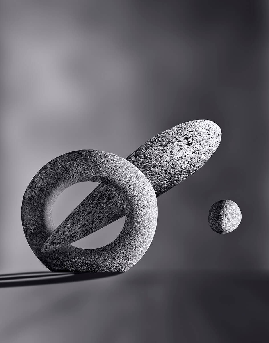 Using my sketches as guides I assembled each image from individually photographed river rocks. I added shadows to simulate what it would really look like as a set in the studio. I sharpened all the rocks to enhance their texture and softened the background to create a more three-dimensional effect. I worked in black and white to emulate the luminosity of classic B&W still-life prints from the darkroom.