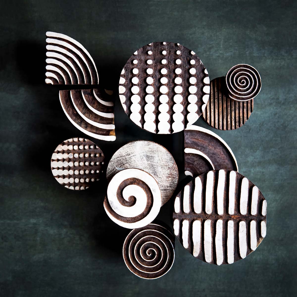 The abstract compositions she created consist of handmade wooden blocks from India, which are usually used as craft pieces for printing on textiles. Hit by the geometric beauty of these so called 'blockprints', which were designed by Nathalie Cassee , she searched in this series for balanced compositions.