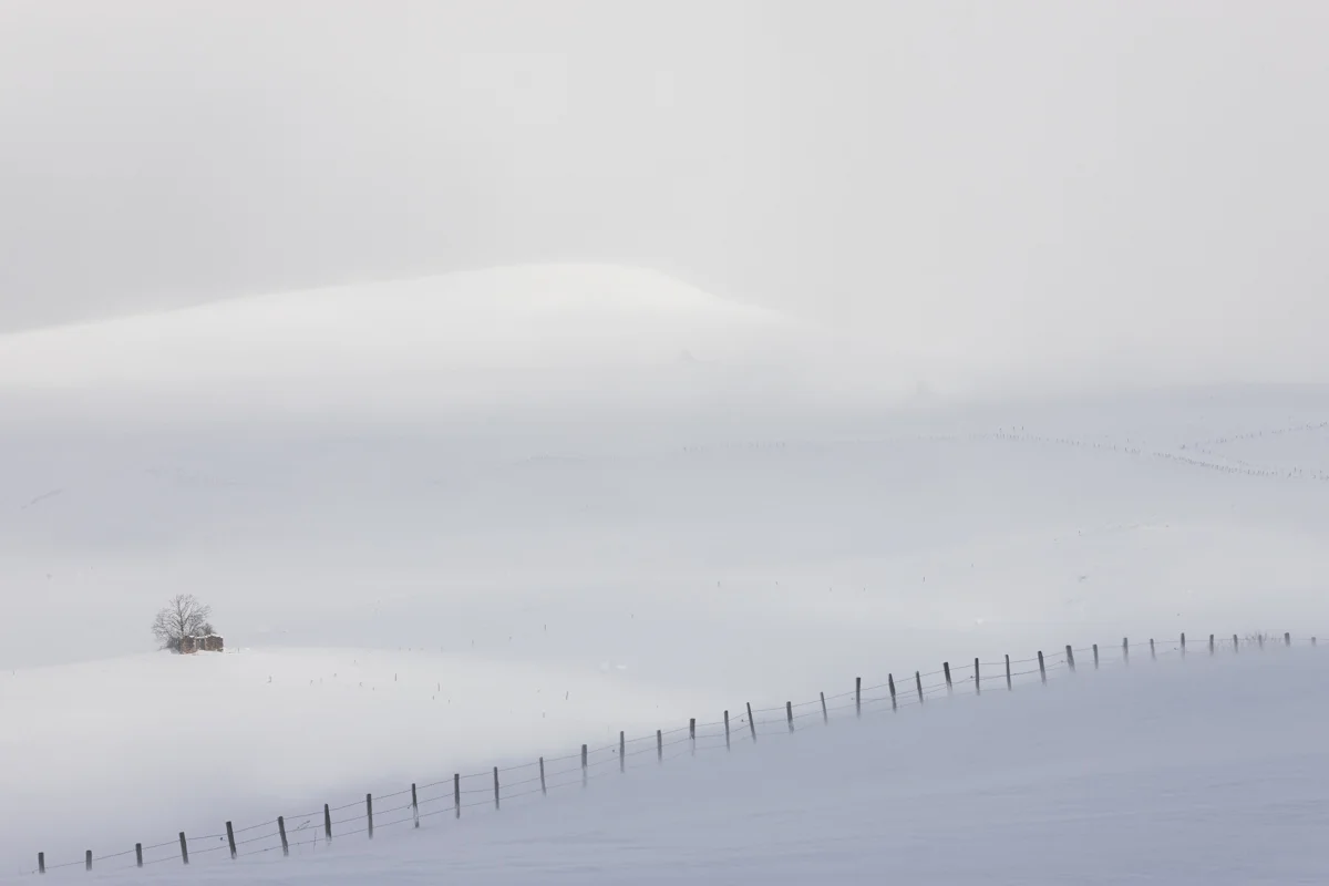 Born in 1970 in France, Mam'AT was initially a researcher in economics before leaving it all behind to settle in a tiny, remote village in the mountains of central France (Cantal) and dedicate herself to photography. She works on landscapes and their perception. These are not dreamy landscapes with majestic reliefs and/or flamboyant colors; on the contrary, the atmospheres are dull, gray, white, cold, and the landscapes are ordinary. A simple fence, a road, a tree, or a buron is enough to catch her photographic eye.