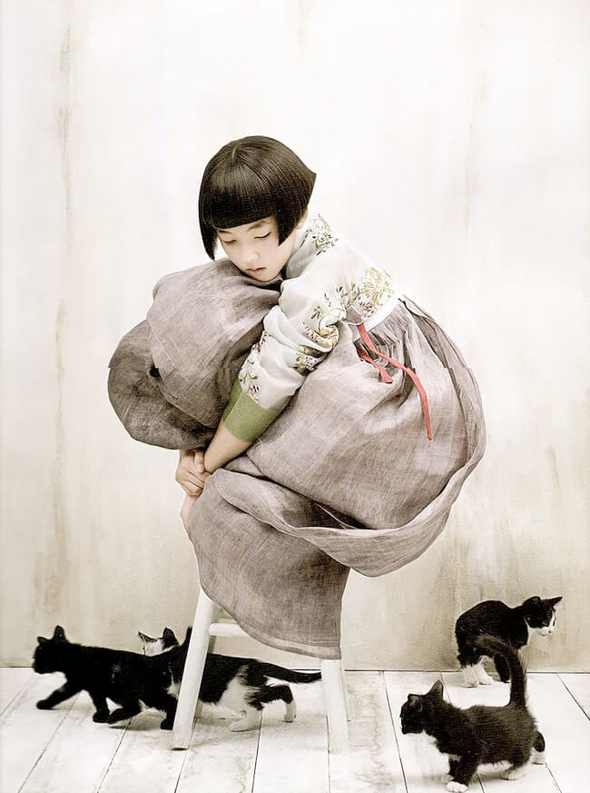 When Vogue Korea asked Kim Kyoungsoo, a renowned fashion photographer to realize a series of fashion portraits that would (re-actualize) the traditionnal Korean costum (Hanbok), he also decided to realize his series Full Moon Story. His models are elegantly staged, wearing somptuous Hanbok, with their haircuts and make-up done perfectly. There is a serenity, poetry and softness which emanates from the pictures that astonishes and instantly puts the viewer in a contemplative state of mind.