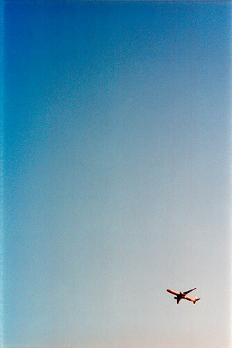 Pushing 35mm negatives to the extreme through a 90mm lens, he lets the film be flooded by the infinite heavenly hue, the changing colors of the horizon sometimes grayish, or yellow and pink, the broad spectrum of colors that characterize the sky.